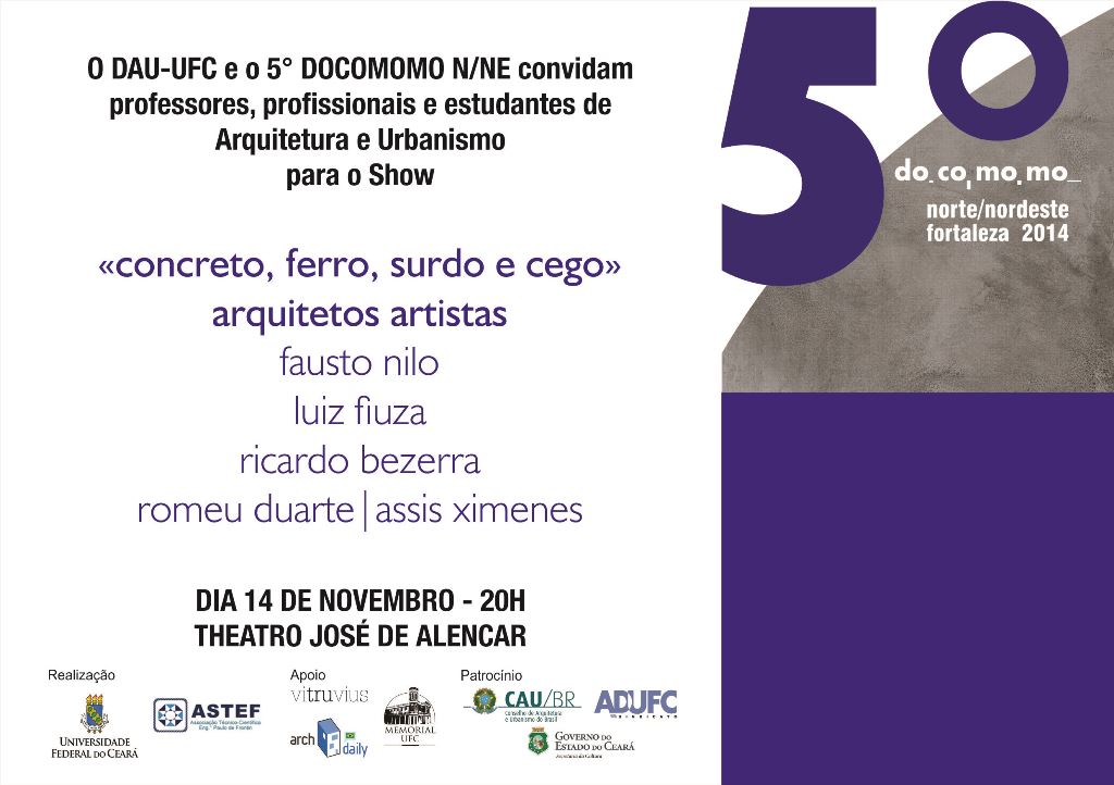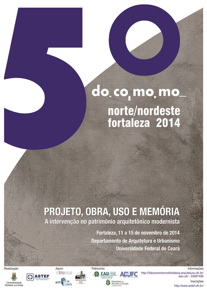 É com grande satisfação que comunicamos as V.Sas. que o DOCOMOMO BRASIL e o Departamento de Arquitetura e Urbanismo da Universidade Federal do Ceará (DAU-UFC) realizarão o 5° DOCOMOMO N/Ne – Seminário de Documentação e Conservação do Movimento Moderno Norte/Nordeste – na cidade de Fortaleza entre os dias 11 a 15 de novembro de 2014 com a temática “Projeto, obra, uso e memória: a intervenção no patrimônio arquitetônico modernista”. O tema do 5° DOCOMOMO N/Ne se justifica pela necessidade de debater criticamente sobre o processo de intervenção e documentação, em sentido amplo – projetos, obras, usos e memórias – do patrimônio moderno no Norte e Nordeste do Brasil.
