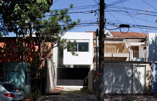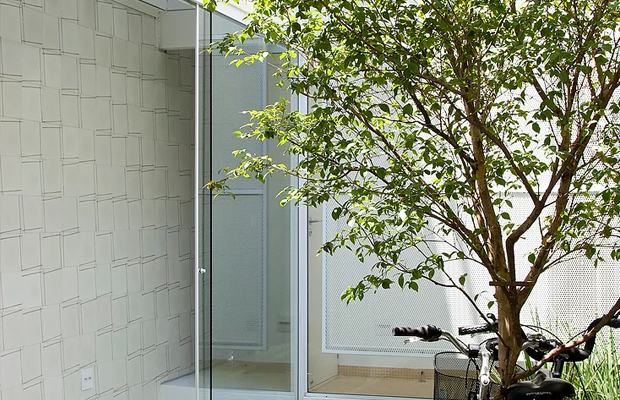 Segundo Clara Reynaldo, a mudança no uso do espaço se deu a partir do entendimento de ambos de que uma arquitetura segura é aquela que é permeável, sem muros ou grades. “Com o carro sempre estacionado na rua, a área de 2,70x5m era destinada à moto de Lourenço, o que começou a nos incomodar”, explica.