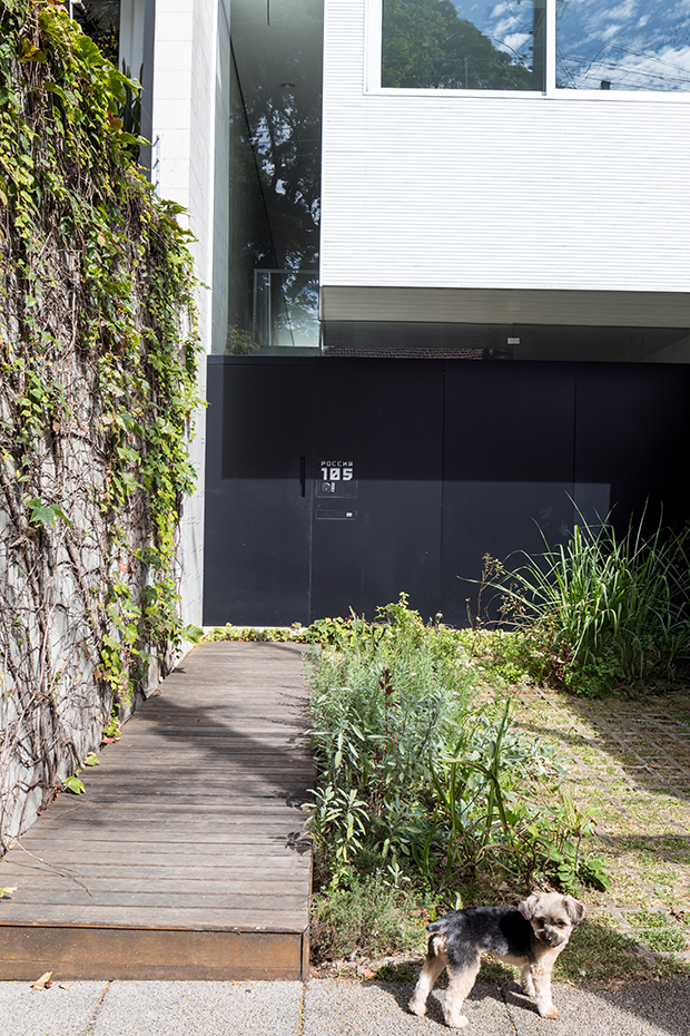 A pequena plantação se dá em módulos vazados de concreto, os mesmos por onde cresce a grama. Um deck faz a transição entre a calçada e o interior, separado pela porta de painel melamínico preto. Para isso, um sistema automático de irrigação molha as verduras e ervas duas vezes por dia. Entre elas, há as chamadas plantas alimentícias não convencionais (PANCs), como taioba e azedinha.