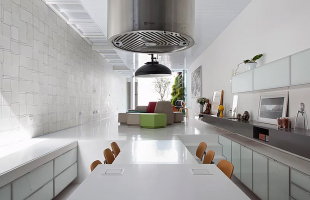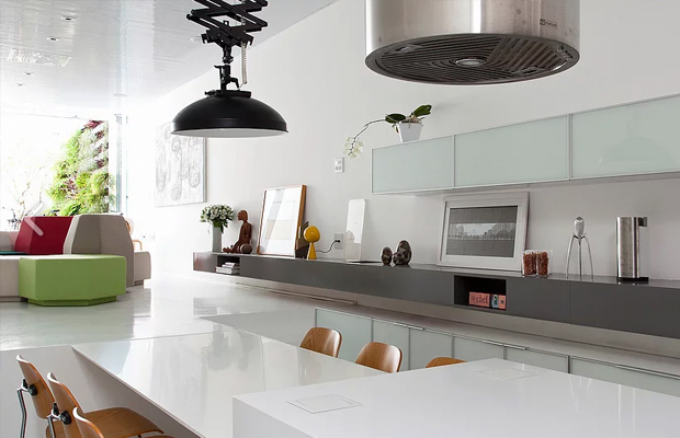 Rebaixada, a cozinha oferece ao visitante uma perspectiva inusitada. Integrada à sala, coloca-se como parte do mesmo espaço, mas o rebaixamento do nível ressalta a diferença entre os ambientes.