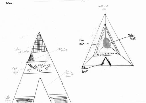 A casa em forma de pirâmide ecológica de Antoni (10 anos) está equipada com painéis solares, uma porta para o seu carro e um ponto de observação para a paisagem local. Também se beneficia de uma porta de frente deslizante.