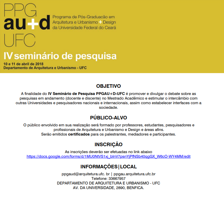 IV Seminário de Pesquisa PPGAU+D-UFC acontece nos dias 10 e 11 de abril de 2018