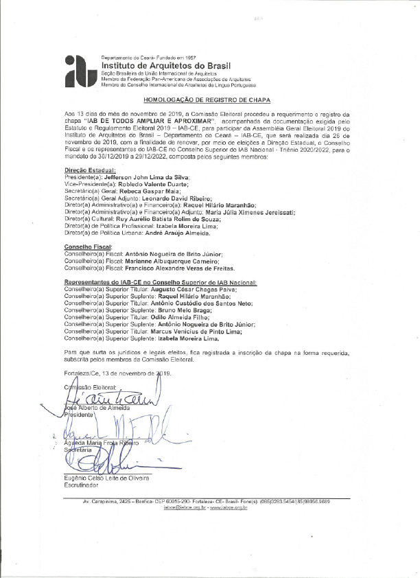 EDITAL DE CONVOCAÇÃO DE ASSEMBLÉIA GERAL ELEITORAL 2019 DO IAB-CE O Instituto de Arquitetos do Brasil – Departamento do Ceará- ...