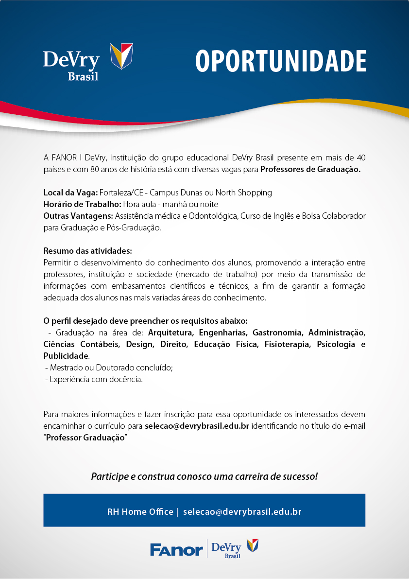 Vagas abertas para a área de Arquitetura na Fanor DeVry. Os candidatos podem se inscrever através do nosso portal Trabalhe conosco (www.fanor.edu.br) ...