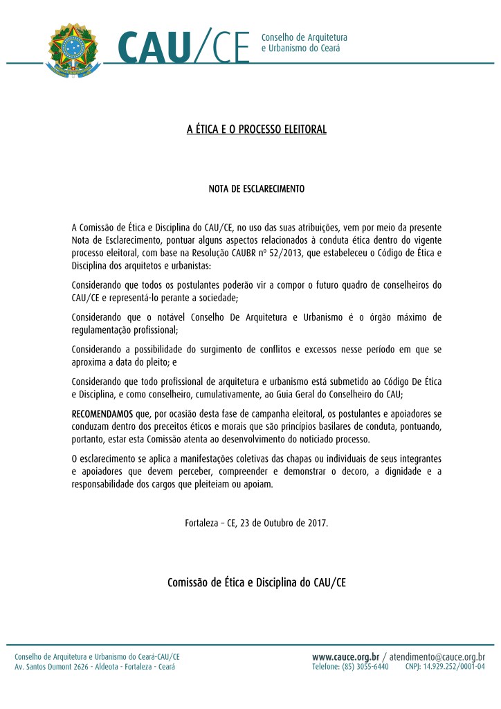 Comissão de Ética e Disciplina do CAU/CE lança nota de esclarecimento sobre conduta ética durante o processo eleitoral ...