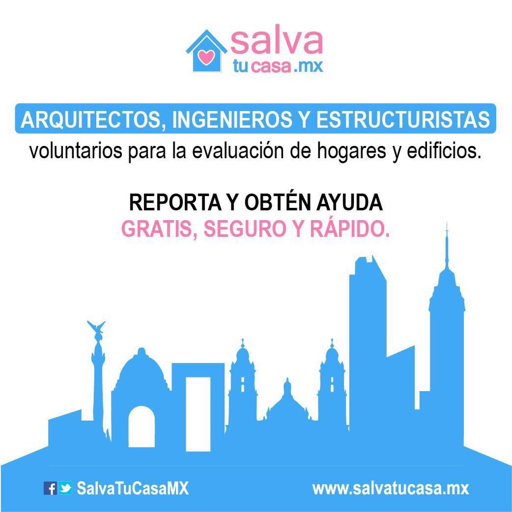 Por outro lado, Salva Tu Casa Mx é uma plataforma colaborativa que põe arquitetos e engenheiros em contato com os cidadãos que foram afetados pelo abalo sísmico do dia 19 de setembro de 2017. O objetivo deste projeto é centralizar a informação dos edifícios afetados e fornecê-los ao governo Mexicano para que os voluntários visitem os edifícios danificados o quanto antes, e assim informar as autoridades competentes. Acesse aqui para completar o formulário de avaliação dos danos no seu imóvel ou para inscrever-se como arquiteto ou engenheiro voluntário.