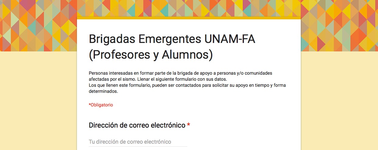 Na Cidade do México, o Colégio de Arquitetos se uniu com a SEDUVI (Secretaria de Desenvolvimento Urbano e Moradia) para coordenar os esforços da comunidade profissional. Estão localizados na Rua Veracruz 24, Delegação Cuauhtémoc, Bairro Roma Norte, 06700. No dia 20 de setembro, socorreram mais de mil voluntários, entretanto ainda não são suficientes pois a quantidade de imóveis que necessitam avaliação urgente é enorme. A equipe local da Google está trabalhando em conjunto para realizar um levantamento georreferenciado. Mande um e-mail para colaborar ou solicitar uma avaliação para brigadacdmx@gmail.com e brigadacdmx2@gmail.com. É importante copiar ambos endereços porque o primeiro está saturado.