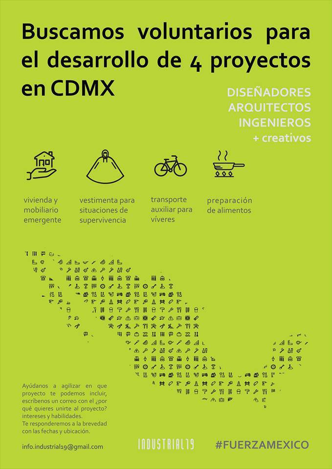 Industrial19 é um projeto sem fins lucrativos criado por alunos do Centro de Pesquisas em Desenho Industrial da UNAM. O projeto busca apoio de pessoas que queiram contribuir com projetos de curto, médio e longo prazo relacionados ao projeto de produtos, que proporcionem dignidade às vítimas do terremoto de 19 de setembro.