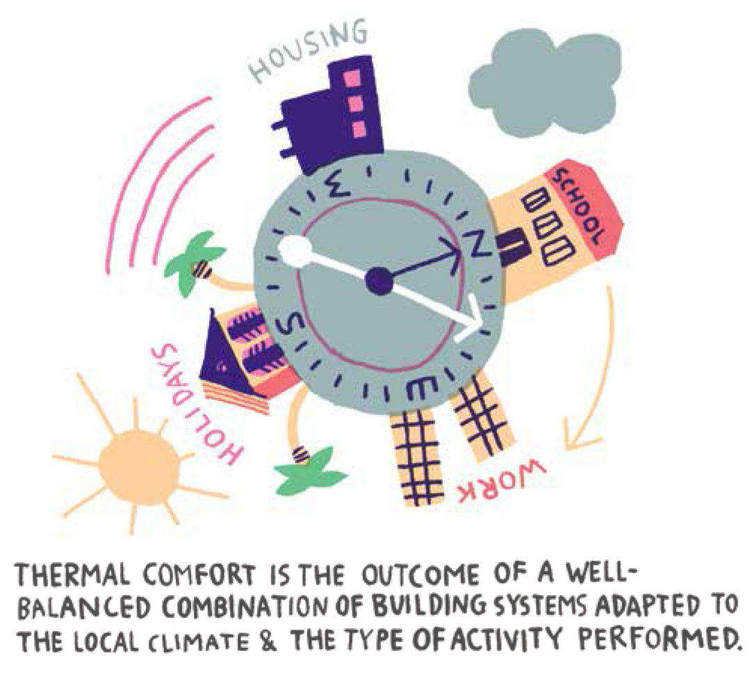 Evidentemente, não há “padrões universais” ou “faixas de conforto recomendadas” ao projetar sistemas de construção, já que atletas treinando em uma academia no México não se sentirão confortáveis em um interior com os mesmos sistemas construtivos de uma casa de repouso na Dinamarca, por exemplo. É por isso que, se definirmos brevemente o “conforto térmico”, trata-se da criação de sistemas construtivos adaptados ao ambiente local e às funções do espaço, cooperativamente.