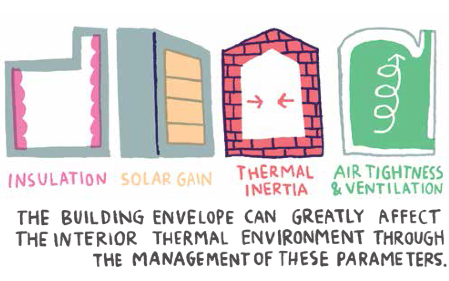 Como gerenciar os parâmetros do envelope do edifício pode afetar muito o ambiente térmico interno, garantir altos níveis de isolamento em ambas as áreas, opacas e envidraçadas, reduz o ganho de calor nas estações quentes e conserva o calor durante as estações frias. O ganho solar (quanto calor é gerado à medida que o sol é absorvido no edifício) é controlado através do projeto e orientação do edifício, da proporção de áreas opacas a envidraçadas, porcentagem de reflexão de calor, nível de isolamento e quantidade de elementos de sombreamento próximos.