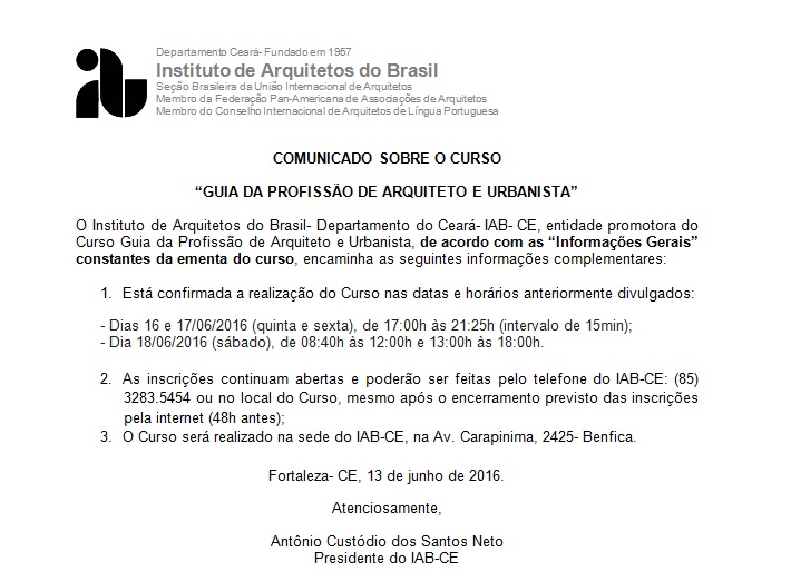 O Instituto de Arquitetos do Brasil- Departamento do Ceará- IAB- CE, entidade promotora do Curso Guia da Profissão de Arquiteto e Urbanista, de acordo com as “Informações Gerais” constantes da ementa do curso, encaminha as seguintes informações complementares: