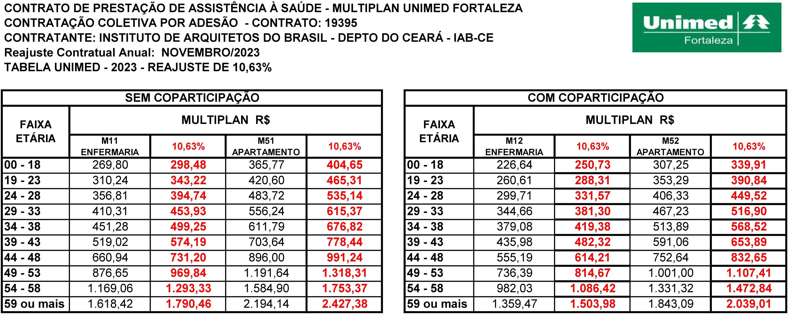 O contrato firmado entre a UNIMED e o IAB-CE (com Termo de Cooperação com CAU/CE), celebrado em novembro de 2018, tem previsão de reajuste anual, no mês de novembro de cada ano.