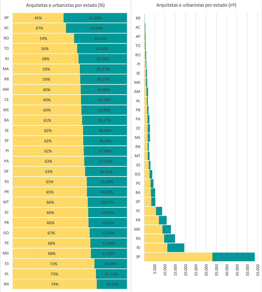 Na distribuição por Estados, São Paulo naturalmente, por ter o maior contingente de profissionais (53.541), possui o maior número de arquitetas e urbanistas: 33.057, em contraposição a 20.484 homens. Em termos percentuais, 11 Estados estão acima da média nacional de arquitetas e urbanistas: RN, AL, ES, MG, PE, GO, PB, SC, MT, PR e RS. O DF e o PA empatam. A menor presença ocorre nos Estados do AC e do AP, com percentuais abaixo de 50%.