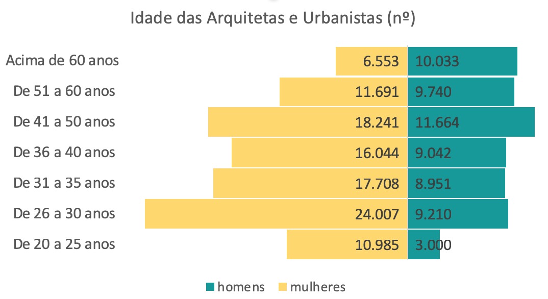 O CAU também divulgou uma radiografia mostrando a força feminina na Arquitetura e Urbanismo do Brasil. Na faixa etária até 25 anos, as profissionais representam 79% do total de arquitetos e urbanistas. Ou seja, três em cada quatro. Entre 26 e 30 anos, o percentual é de 72%. A maioria se mantém até a faixa dos 60 anos, acima da qual os homens assumem o posto com 60%.