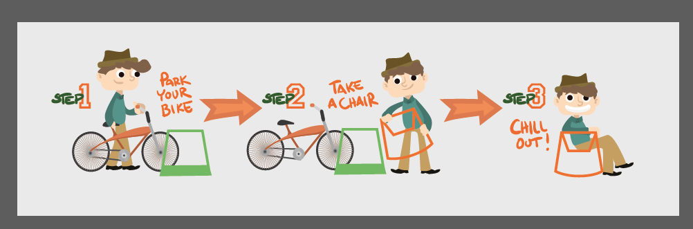 Quanto à armazenagem, ao invés de desenvolver um espaço único, grande e robusto para guardar as cadeiras à noite, pensamos em estruturas menores, que poderiam ser distribuídas por todo o parque e que dublassem como racks para bicicletas, encorajando hábitos mais saudáveis. Estacione sua bicicleta, pegue uma cadeira e relaxe. Três passos simples para uma vida melhor.