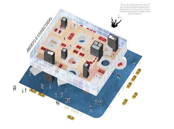 Os programas são fragmentados e intercalados por toda a edificação. O meio virtual é responsável pela conexão e pelo funcionamento coeso dos diversos fragmentos de programa dispersos ao longo dos andares da edificação e também da cidade. A tecnologia nos informa a localização e disponibilidade de cada um dos recursos que compõem o projeto.