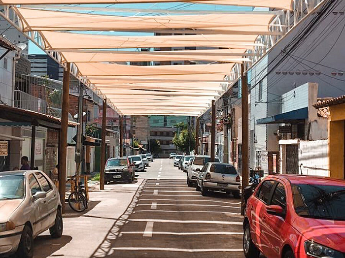 Há diversas maneiras de despertar o afeto – e consequentemente o respeito e o cuidado – por parte dos moradores com os espaços da cidade. Uma delas é o mobiliário urbano, estudado com profundidade pela arquitetura e tema de diversos trabalhos nas últimas décadas. Em Fortaleza, o concurso “Vamos pela Sombra”, realizado pelo Instituto Iracema (mais informações a seguir) em conjunto com a Prefeitura, buscou incentivar a ocupação de alguns espaços públicos com essas peças, de forma criativa e acessível. Os arquitetos Diego Ricca, Jairo Diniz e Leonardo Veras elaboraram um inovador projeto de mobiliário urbano para a Rua Padre Justino, na Praia de Iracema.