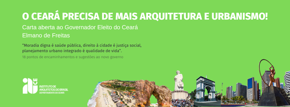 O Instituto de Arquitetos do Brasil, instituição fundada em 1921, através do seu Departamento do Ceará, fundado há 65 anos, vem ratificar o conjunto de propostas para o seu futuro governo, como parte da agenda mundial, nacional e regional de desenvolvimento social e econômico, priorizando a qualidade e o cuidado com a vida da população.