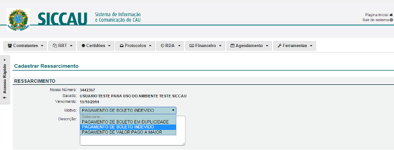3 – Em “Motivo”, selecione “PAGAMENTO DE BOLETO INDEVIDO”. Em descrição, escreva “Ressarcimento de multa por não justificativa de ausência no processo eleitoral de 2014″.